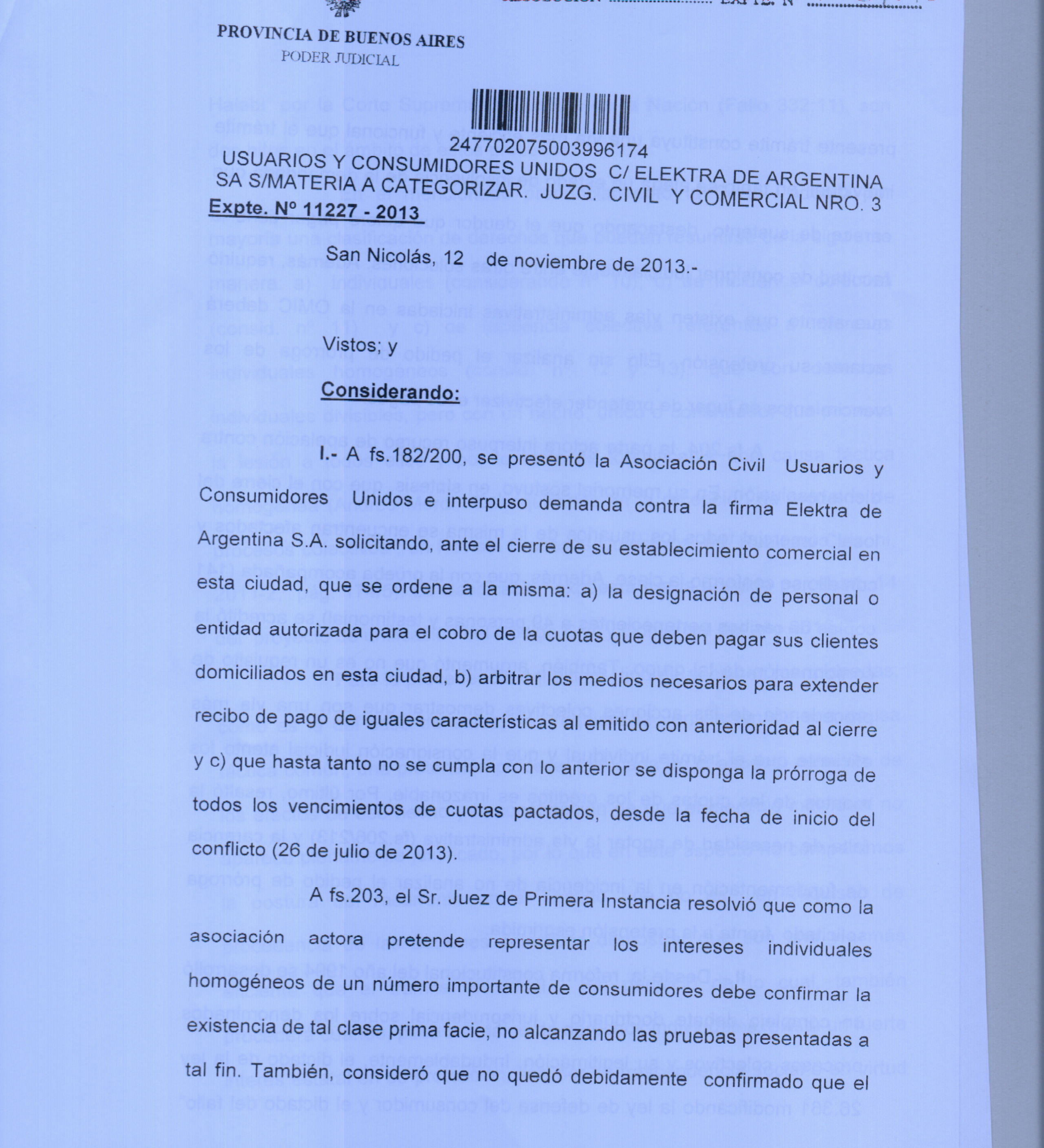 En fecha 12 de Noviembre de 2013 la Cámara de Apelaciones en lo Civil y Comercial de San Nicolás se pronunció en la causa «Usuarios y Consumidores Unidos c/ Elektra de Argentina S.A. s/ Materia a categorizar», revocando la decisión de primera instancia que había impedido la tramitación de una acción colectiva de carácter urgente promovida por la organización actora en beneficio de los clientes de la empresa Elektra domiciliados en la ciudad de San Nicolás.