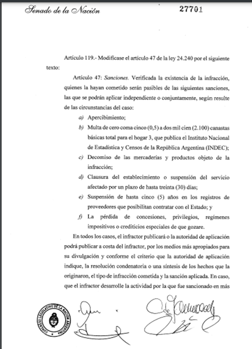 El 16 de noviembre de 2022 la Cámara de Senadores de la Nación aprobó el proyecto de ley de presupuesto del Estado Nacional para el año 2023. Su art. 119 aumenta drásticamente el monto de sanciones por multas administrativas en los términos del art. 47 de la Ley de Defensa del Consumidor N° 24.240 y modificatorias.